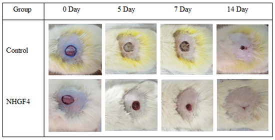Over the second week, the wounds continued healing in Group II (NHGF4), with the scab becoming more substantial. In contrast, the wounds in Group I (negative control) continued to exhibit inflammation, and the healing process was slower, with no sign of scab formation. By the end of the two weeks, Group II (NHGF4) showed complete wound healing, with the scabs falling off and the skin looking normal, while Group I (negative control) still had open wounds with visible signs of inflammation. Overall, the study showed that the treatment had a positive impact on wound healing, accelerating the process and reducing the time required for completing healing.