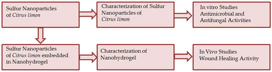 The method used by K Khairan et al. (2023) for synthesizing sulfur nanoparticles was slightly modified [40]. A total of 10 mL of plant extract was taken, and 5 g of sodium thiosulfate pentahydrate (Na2S2O3·5H2O) was added and stirred with a magnetic stirrer for 20 min. The extract was then agitated while 10 mL of 10% HCl was added dropwise using a dropper. To ensure homogeneous sulfur precipitation, continuous stirring was adopted. For 10 min, the mixture was centrifuged at 5000 rpm. It is essential that the sulfur precipitates are thoroughly cleaned after centrifugation by being washed three times in double-distilled water, with the supernatant discarded following the final washing. Refrigeration was used to dry sulfur nanoparticles after they had been collected. The sulfur nanoparticles were stored at room temperature after drying for further studies. The sulfur nanoparticles of Citrus limon were further characterized for in vitro, antimicrobial, and antifungal activities. Furthermore, these prepared SNPs were embedded into Nanohydrogel formulation for in vivo, and wound healing activities (Figure 11).