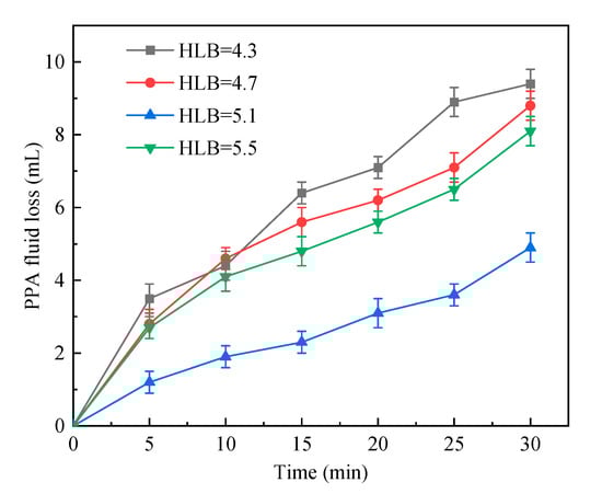 The HLB value of emulsifiers has an important effect on their hydrophile and lipophilic performance. A reasonable HLB value ensures the reaction system is stable during the polymerization. Therefore, the HLB value of emulsifiers in the reaction system was changed from 4.3 to 5.5, and other conditions were fixed during the polymerization process, as shown in Table 1. Figure 1 shows that with the increasing HLB value, the PPA fluid loss first decreases and then increases. The PPA fluid loss was relatively high, with an HLB value of 4.3. In the presence of the emulsifier Tween 60, the HLB value grew, and the PPA fluid loss declined. As the HLB value reached 5.1, the PPA fluid loss dropped to the lowest, when the ratio of Span 80: Tween 60 was 9:1. However, with the further growth of the HLB value, the PPA fluid loss increased. When the HLB was 5.1, the system demonstrated best plugging performance, indicating that the optimal HLB value was 5.1.