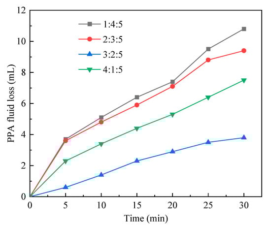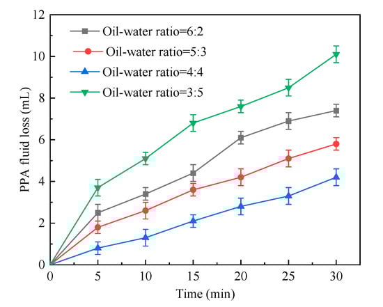 PPA fluid loss vs. time in cases of different oil–water ratios.