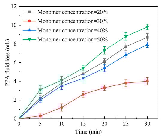 The high polymeric microsphere content of dispersion was gained through improving total monomer concentration. The total monomer concentration of the reaction system was changed while other synthesis conditions remained unchanged as shown in Table 4, and the corresponding test results are shown in Figure 4. As the total monomer concentration grew, the PPA fluid loss first decreased and then increased. For a total monomer concentration of 20%, the PPA fluid loss was relatively high. It dropped greatly to the lowest value for a total monomer concentration of 30%. Nonetheless, as total monomer concentration continued to grow to 40%, the PPA fluid loss rate rose considerably. Such a growth trend of the PPA fluid loss remained as the total monomer concentration reached 50%. The reasons were that with the increasing total monomer concentration, the polymerization degrees of the synthesis product rose, which led to good plugging performance. However, an excessively high total monomer concentration caused the decline in the polymerization degrees, which reduced the plugging strength. When the total monomer concentration was too high, the heat dissipation was slow, the reaction accelerated, the steric hindrance effect for free radicals at the chain end intensified, and the pre-mature chain termination occurred. When the total monomer concentration was 30%, the polymerization degrees were the maximum, and the plugging strength was the strongest, associated with the lowest PPA fluid loss. Given such plugging performance, the optimal total monomer concentration was determined as 30%.
