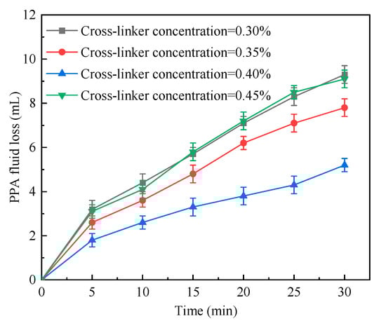 PPA fluid loss vs. time in cases of different cross-linker concentrations.