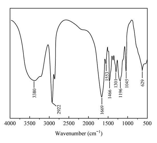 The infrared spectrum of AMN (Figure 6) showed that the characteristic absorption peak of symmetrical stretching vibration of −NH2 in AM was at 3380 cm−1; that of asymmetrical stretching vibration of amide groups in AM was at 1669 cm−1 []; for sulfonic acid groups in AMPS, the characteristic absorption peak of asymmetric stretching vibration was at 1196 cm−1, and that of symmetric stretching vibration of sulfonic acid groups was at 1045 cm−1; the absorption peak of C-S in AMPS was at 629 cm−1; the stretching vibration peak of −CH was at 2922 cm−1; the absorption peak of −CON in NVP was at 1466 cm−1; the absorption peak of −C=O in NVP was at 1301 cm−1. The characteristic peaks of AM, AMPS and NVP are included in the infrared spectrum, indicating that the three monomers had been successfully copolymerized.