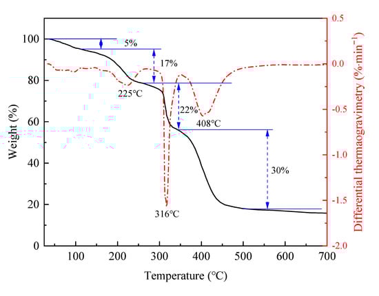 The thermogravimetric variation of AMN is shown in Figure 7. The thermal decomposition of AMN could be divided into four stages: 43 °C~105 °C, 105 °C~257 °C, 257 °C~342 °C and 342 °C~512 °C. The first stage highlighted the loss of free water, and the second stage was the loss of bound water. The third stage was characterized by the side chain breaking of polymeric microspheres, and the degradation rate was the highest at 316 ℃ []. The fourth stage featured the breaking of carbon chains of polymeric microspheres, and the fastest degradation rate occurred at 408 °C. The abovementioned results demonstrated that the AMN were stable at a temperature below 300 °C and thus had high thermal stability.