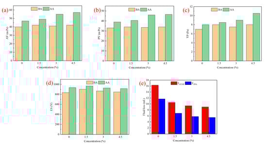 Values of the (a) AV, (b) PV, (c) YP, (d) ES and (e) FHTHP and FPPA of OBFs with different concentrations of AMND before and after aging (BA and AA) at 130 ℃.