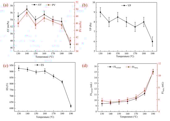 The thermal tolerance of AMN was evaluated by testing the performance of OBFs with 3% AMND under different temperature conditions. The test results are shown in Figure 10. As the hot rolling temperature increased from 130 °C to 180 °C, the yield point and demulsification voltage of drilling fluids declined—specifically, the yield point decreased from 9.0 Pa to 8.0 Pa, and the demulsification voltage decreased from 927 V to 816 V. Yet, the rheological and emulsifying properties remained stable. The HTHP fluid loss increased from 9.4 mL to 11.2 mL, and the PPA fluid loss increased from 5.8 mL to 7.5 mL, which were both far lower values than those of OBFs. However, for an elevated hot rolling temperature of 190 °C, the yield point and demulsification voltage decreased greatly—the demulsification voltage dropped below 800 V. Moreover, the fluid loss increased significantly to a value close to that of OBFs, indicating that the plugging performance was considerably degraded. The above analysis showed that the AMN had high thermal tolerance of up to 180 °C.