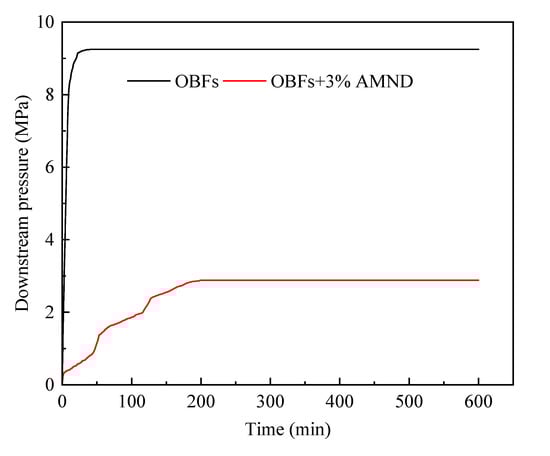 The pressure transfer curve is given in Figure 11. In the case of OBFs flowing in cores, the downstream pressure increased to the maximum within a short time. Nonetheless, it required two hours for the downstream pressure to peak, after adding 3% AMND into OBFs, and moreover, the corresponding equilibrium pressure decreased by 69% compared with that of the OBFs. It was suggested that the AMN effectively plugged the pores of cores and prevented the transfer of upstream pressure to the downstream, which indicated good plugging performance [].