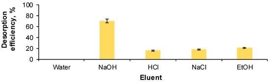 Distilled water, one base (sodium hydroxide, 1 M), one acid (hydrochloric acid, 1 M), a salt (sodium chloride, 1 M) and an alcohol (ethanol, 1 M) were chosen as possible desorbents. The selection was made taking into consideration the ability of eluting the contaminant and the possible impact on the environment and human health. It must be mentioned that Australian National Industrial Chemicals Notification and Assessment Scheme using the Inventory Multitiered Assessment and Prioritisation (IMAP) categorizes chemicals into three classes: Tier I which includes compounds dissociable in environment; Tier II with compounds that can be dangerous and need additional exploration; and Tier III which comprises compounds that require detailed investigation of the aspects identified in Tier II. Therefore, due to the fact that they do not represent an extreme threat neither to the environment nor to humans, Tier I chemicals are recommended to use.