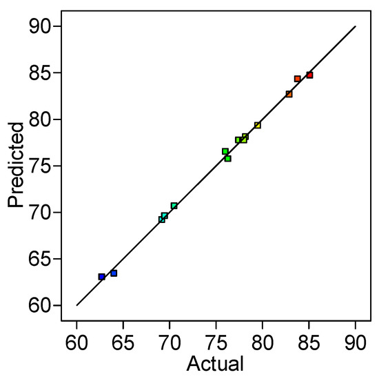The correlation coefficient (R2) is 0.9973, while the predicted correlation coefficient (R2 predicted) is 0.9601, and the adjusted correlation coefficient (R2 adjusted) is 0.9923. Their closeness to 1 and the difference between the last 2 of them being lower than 0.2 sustain the accuracy of the obtained model. The coefficient of variation of 0.7937% also indicates the consistency of the conducted experiments with the predicted data. The adequate precision of 44.3707 (>4) shows a satisfactory signal and supports the conclusion that the model is suitable to navigate the design space.