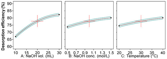 The F-value of 5.66 denotes that the lack of fit is not significant relative to the pure error. Furthermore, its p value of 0.1538 (higher than 0.05) advances the idea that the data predicted by the model are very similar to those obtained through experiments. The F-values for sodium hydroxide volume, sodium hydroxide concentration and working temperature were 1307.43, 227.30 and 175.21, showing that the eluent volume has the highest influence on the desorption process. p-values less than 0.05 designate that the model terms are significant. In this case, all three factors in linear form and the quadratic forms of NaOH volume and of NaOH concentration are considered significant terms.