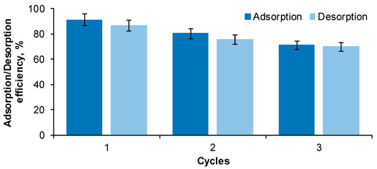 The focal purpose of the regeneration of cherry stones–chitosan hydrogel (CSCH) beads was to establish its ability of adsorbing RB dye after multiple consecutive adsorption/desorption cycles. Three such cycles were performed when the selection of eluent and the optimization of the working conditions by RSM-BBD were finalized. The process evolution for an initial contaminant concentration of 30 mg/L is pictured in Figure 6.