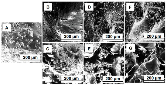 SEM images for the prepared adsorbent before RB adsorption (A), after 1st, 2nd and 3rd cycle of RB adsorption (B,D,F) and after 1st, 2nd and 3rd cycle of RB desorption (C,E,G) (Device: TESCAN MIRA (TESCAN Orsay Holding, Brno, Czech Republic); Detection mode: Normal secondary electron in high vacuum; Detector: large field detector; Accelerating voltage: 20 keV; Beam current: 300 pA; Magnification: 320×; Field of view: 873 µm; Working distance: 5 mm; Scan speed: 6).