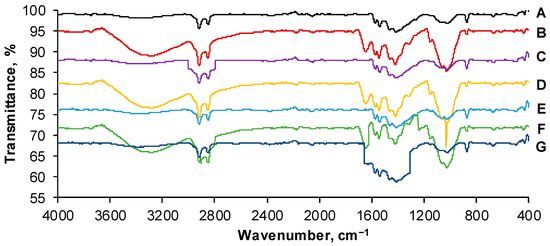 FTIR spectra for CSCH adsorbent before RB adsorption (A), after 1st, 2nd and 3rd cycle of RB adsorption (B,D,F) and after 1st, 2nd and 3rd cycle of RB desorption (C,E,G) (Device: IRSpirit FT-IR spectrometer (Shimadzu, Bucharest, Romania); Accessory: QATR; Wavenumber range: 4000 cm−1–400 cm−1; Scans: 45 scans/min.; Resolution: 4 cm−1; Background spectrum reference: air; Cleaning solution: ethanol).