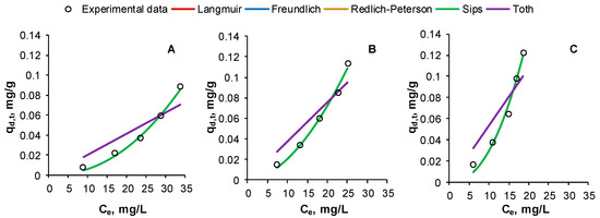 The graphical representation of experimental data fitted on the cited isotherm models and the specific calculated parameters are visible in Figure 10 and in Table 4 for the three desorption cycles. Overlaps of the Langmuir, Redlich–Peterson and Toth isotherms and of the Freundlich and Sips models can be mentioned.