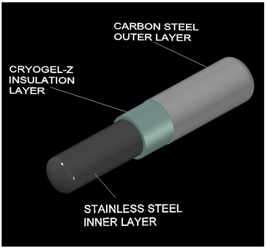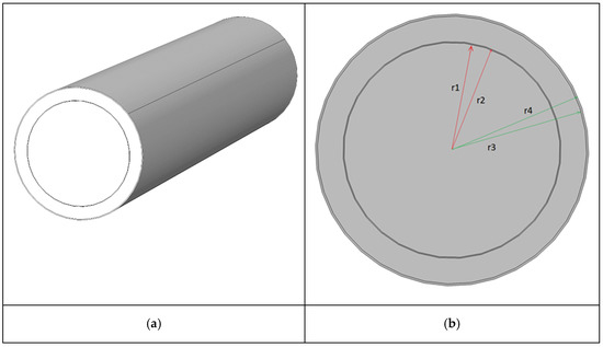 In the simulation, a simplified geometry was chosen, consisting of a single cylindrical body (Figure 13a) that represents the lateral surface of the cryogenic tank. As mentioned in Section 2.3, the geometry used in the model is subject to simplifications as the tank ends, bearings, and connections with the truck have been omitted, focusing on the heat exchange along the lateral surface. The model geometry involved four concentric cylinders 1.3 m in length. The cross-section in Figure 13b highlights the four domains constituting the internal arrangement of the tank: