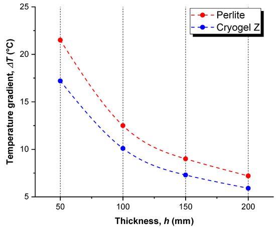 Computed temperature gradient (ΔT) within the LNG domain after 96 h storage as a function of insulator thickness (h).