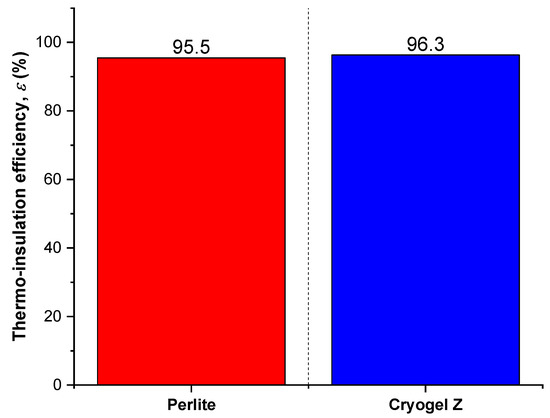 Thermo-insulation efficiency (ε) of perlite and Cryogel ® Z systems at 96 h for 200 mm thickness.