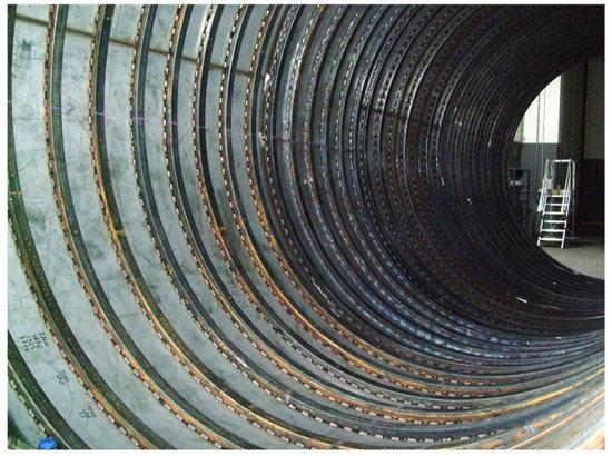 It would therefore seem that the use of Cryogel ® Z increases the weight of the tank by about 116% with respect to the traditional perlite-based system. However, it must be considered that the insulation with perlite + vacuum makes it necessary to strengthen the external casing to be able to resist crushing due to the vacuum-preventing tank collapse phenomena. As illustrated in Figure 4, such an operation is carried out through circumferential stiffening rings welded on the internal surface of the tank casing [20,21]. Considering a center distance of about 220 mm, for a 13 m tank (analyzed in this work) about 13000/220 = 60 stiffening rings would be needed in adopting the perlite-based insulation system. The set of rings, generally made of S275JR structural steel, would contribute a total weight of 800 kg [17]. By using the Cryogel ® Z system, the strengthening ring arrangement can be omitted, as it operates in the absence of vacuum condition, thus considerably reducing the weight increase compared to the perlite-based insulation by more than 50%. The above considerations were deduced by fixing the same thickness of the outer casing for the two types of insulating systems (perlite + vacuum and Cryogel ® Z) for simplicity in the FEM analysis. However, in the case of the Cryogel ® Z blanket, since it does not have to realize the vacuum condition, the airtight cavity is not necessary, and the outer casing has the sole purpose of protecting the insulating material. Therefore, other lightweight materials (e.g., aluminum) can also be used for the external casing replacing the steel, meaning the thickness can be reduced by at least 1 mm without any structural problems for the tank. These additional aspects make it possible to achieve, for the same volume of LNG transported, tanks insulated with Cryogel ® Z with a lower tare weight than tanks insulated with the perlite + vacuum system.