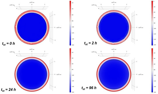 This section reports the results of the time-dependent FEM analysis investigating the LNG temperature evolution as a function of tst by using perlite + vacuum and Cryogel ® Z as insulating systems (200 mm thickness) in the cryogenic tank. Figure 5 graphically shows the temperature distribution results for different tst (0 h, 2 h, 24 h, and 96 h) to appreciate the thermal profile of LNG in response to the influence of the Cryogel-based insulating system.