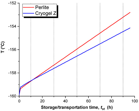 Figure 6 plots the temperature variations as a function of tst for the two insulating systems under examination. At the beginning, the LNG temperature increases rapidly, due to the ingress of heat from outside. After about 10 h, different temperature trends are noted, exhibiting a linear increase but with different slopes. The slope reflects the ability of the insulating system to counteract the entry of heat from the outside, which causes a temperature increment of LNG. In support of the results obtained in the previous section, it is evident that the Cryogel ® Z system, for the same tst, ensures a lower temperature increase rate than the perlite + vacuum system. The trend obtained by the FEM model is in good agreement with the results of previous numerical [22] and experimental analysis [23] addressed by other authors in the context of LNG storage in cryogenic conditions. Huerta and Vesovic [22] attributed the temperature increase with time to the growing ingress of heat from the outside towards the LNG domain because of an increase in the vapor area as the result of evaporation. Perez et al. [23] explained the early-time rapid change in temperature to the liquid–vapor transition of LNG, which is triggered once the initial liquefaction temperature of −160 °C is exceeded.