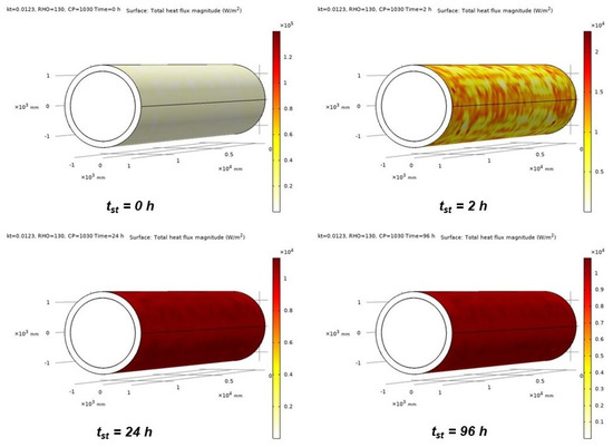 FEM analysis of the Q distribution obtained at tst = 0 h, 2 h, 24 h, and 96 h for the Cryogel-based insulating system.