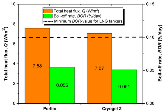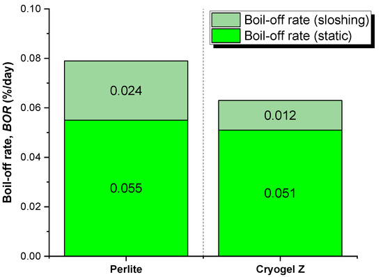 In this calculation, however, the influence of damping from the insulating layer was not considered. The damping factor of the materials used, like cryogenic insulators, plays a key role in suppressing the sloshing and therefore in preventing the generation of boil-off gas. To assess the influence of this contribution, the research work from Fesmire et al. [30], who studied the thermo-mechanical performance of different insulation systems in cryogenic tanks under vibration cycles, was considered. The results highlighted that, under non-vacuum conditions, the aerogel technology insulator provided a heat leak under a frequency regime about 50% lower than perlite-based systems. Aerogel showed advantages over perlite in higher damping and minimal mechanical settling. Therefore, in consideration of this contribution, the overall BOR of the Cryogel ® Z-based tank will be equal to 0.063, which is about 20% lower than those of the perlite insulating system (Figure 10).