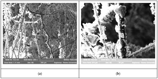 The test sample was first analyzed by scanning electron microscopy (SEM) to investigate its microstructure. SEM was conducted by using a Tescan MIRA 3 SEM (Tescan, Brno, Czech Republic) on a square specimen of 1.5 cm per side previously graphitized to make it conductive for microscopy analysis. A graphite sputter coater (EM SCD005, Leica, Wetzlar, Germany) was used for the sample preparation. Figure 12a,b shows the SEM micrographs of the Cryogel ® Z acquired in secondary electron (SE) emission mode at different magnifications.