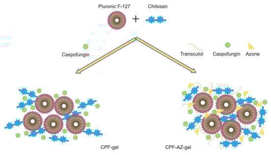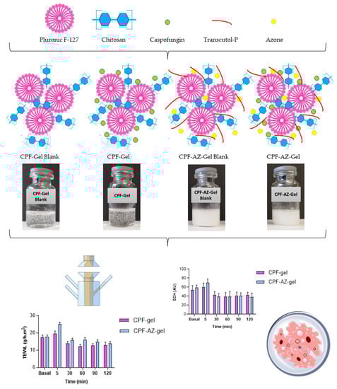 Considering these remarkable findings, the aim of the study was to design and develop a topical delivery system for caspofungin. Two formulations were developed: a caspofungin gel (CPF-gel) and a caspofungin gel with the addition of two promoters: Azone and Transcutol-P (CPF-AZ-gel). The physicochemical, biopharmaceutical, and efficacy properties of both formulations in the treatment of cutaneous candidiasis were compared. Figure 2 illustrates a schematic representation of the development and evaluation of the hydrogels composed of pluronic F-127 and chitosan, with and without permeation enhancers loading caspofungin.