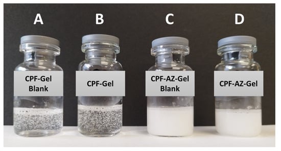 Photograph of drug-loaded hydrogels and nondrug-loaded hydrogels. (A) CPF-Gel without drug; (B) CPF-Gel; (C) CPF-AZ-Gel without drug, and (D) CPF-AZ-Gel.