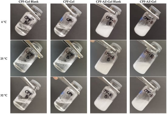 Physical appearance of the hydrogels at different temperatures: 4 °C, 25 °C, and 32 °C.