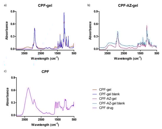 FTIR spectra for the gels: (a) CPF gel (red) and placebo (blue), (b) CPF-AZ-gel (pink) and placebo (cyan), and (c) caspofungin acetate salt Sun-Pharma (purple).