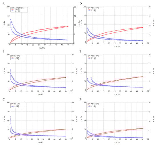 Rheograms of caspofungin formulations. (A) CPF-gel at 10 °C, (B) CPF-gel at 25 °C, (C) CPF-gel at 32 °C, (D) CPF-AZ-gel at 10 °C, (E) CPF-AZ-gel at 25 °C, and (F) CPF-AZ-gel at 32 °C.