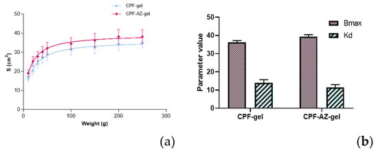 Evaluation of the spreadability of CPF-gel and CPF-AZ-gel, fitting a one-site hyperbola equation: (a) Spreading area (S, cm2) as a function of the applied mass (g) at 22 ± 2 °C; 60 ± 5% RH, and (b) plot of the parameters of the formulas of CPF-gel, and CPF-AZ-gel fitting a one-site hyperbola equation. The data are expressed as the mean ± standard deviation (SD) of the three replicates (n = 3).