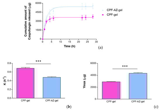 In vitro drug release of caspofungin from the CPF-gel and CPF-ZA gel formulations: (a) release profile of caspofungin over time; (b) release constant (K), estimated by modeling to the best-fit model, corresponding to a one-phase exponential association model; (c) maximum amount released (Ymax) estimated by modeling to the best-fit model, corresponding to a one-phase exponential association model. *** significant statistical differences between the two gels (p < 0.0001).