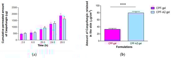 Permeation of caspofungin from CPF-gel and CPF-AZ-gel: (a) permeation profiles of caspofungin depicted as the cumulative amounts of caspofungin permeated through the ex vivo skin over time; (b) amount of caspofungin remaining in the skin at the end of the permeation study (28 h). *** significant statistical differences between the two gels (p < 0.0001).