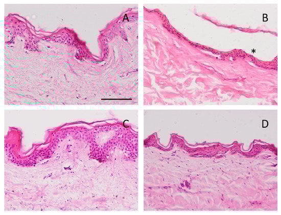 Skin sections stained with hematoxylin and eosin after the ex vivo permeation study, stained and observed under the microscope at 200X. Scale bar = 100 µm. (A) PBS as negative control; (B) ethanol as positive control; (C) CPF-gel and (D) CPF-AZ-gel. Asterisk indicates loss of stratum corneum.