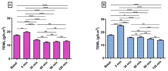 Biomechanical parameters evolution in human volunteers was monitored before the application of the formulations (basal) and 5 min, 30 min, 60 min, 90 min, and 120 min post-application. (A,B) TEWL of CPF-gel and CPF-AZ-gel, respectively, expressed as g/h × m2. (C,D) the SCH of CPF-gel and CPF-AZ-gel respectively expressed as arbitrary units (AU). Significant statistical differences: * p < 0.05, ** p < 0.01, *** p < 0.001, **** p < 0.0001, ns = non-significant. (E) Comparison of the evolution of the TEWL between both formulas: CPF-gel and CPF-AZ-gel. (F) Comparison of the evolution of the SCH between both formulas: CPF-gel and CPF-AZ-gel. Each value represents the mean ± SD (n = 10).