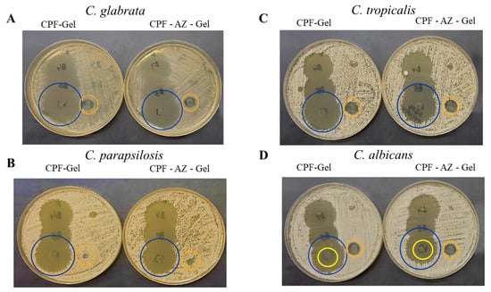 In vitro antifungal activity. (A) C. glabrata (B) C. parapsilosis (C) C. tropicalis and (D) C. albicans. The blue circles show the inhibition halo for CPF-gel and CPF-AZ-gel, the orange circles show the halo growth around the disc with an excipient (gel), and the yellow circles indicate the intrahalo growth of C. albicans.