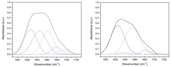 Figure 2. Gaussian deconvolution of UN (left) and DHT (right) collagen film amide I (1600–1700 cm−1) into four component bands, that were β-sheet (blue line, 1610–1642 cm−1), random coil (purple line, 1642–1650 cm−1), α-helix (orange line, 1650–1660 cm−1), β-turn (pink line, 1660–1680 cm−1), and β-antiparallel (teal line, 1680–1700 cm–1) components were detected. The fitted curve is reported with a green (UN) or red (DHT) line, closely overlapping the experimental curve (black line).