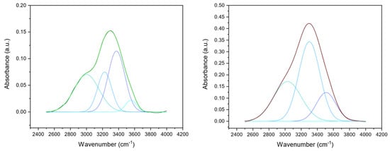 Figure 3. Gaussian deconvolution of FTIR spectrum of UN (left) and DHT (right) collagen film in the ν (OH) region in four components, corresponding to the H-bond distance of 0.25 nm (octane line, at about 3110 cm−1), 0.28 nm (sky blue line, at about 3250 cm−1), 0.29 nm (blue line, at about 3460 cm−1) and 0.31 nm (teal line, at about 3670 cm−1). The fitted curve is shown as the green (UN) or red (DHT) line, closely overlapping the experimental curve (black line).