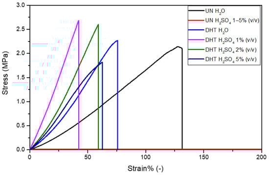 Figure 5. Representative stress-strain curves of uncrosslinked and cross-linked collagen matrices in the presence of water and sulfuric acid 1–5% (v/v).