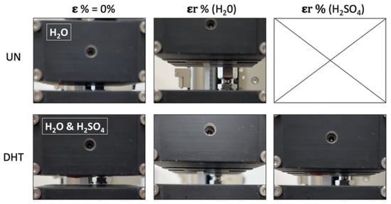 Figure 6. A representative snapshot of uncrosslinked and cross-linked collagen matrices at ε% = 0% and at their maximum deformation before the break in the presence of water and aqueous electrolytes (the snapshot of the UN membrane at ε% = 0% is referred to the sample impregnated with H2O since with H2SO4 it was not possible to perform measurements; the snapshot of the DHT membrane at ε% = 0% is referred to sample impregnated with both H2O and H2SO4 since no significant differences were visible).