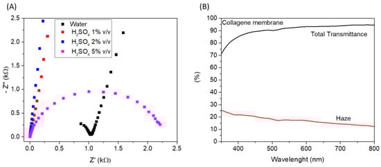 Figure 7. (A) Nyquist plots of electrochemical impedance spectra of the different membranes measured at 0 V; (B) Total transmittance and haze of cross-linked collagen membrane impregnated with H2SO4 1% (v/v).