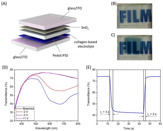 Considering the promising characteristics of the cross-linked membrane, it was tested as an electrolyte in an electrochromic device. The cross-linked collagen membrane impregnated in H2SO4 1% (v/v) was sandwiched between glass/ITO/PEDOT:PSS and glass/ITO/SnO2 (Figure 8A). In this structure, PEDOT:PSS acts as an electrochromic material while SnO2 is the ion storage layer; both materials were deposited by solution processes [4]. In Figure 8D, the electromagnetic spectra in the visible range of this device at different applied voltages have been reported. In the bleached state, the device shows good transparency with a mean transmittance higher than 70% in the 400–800 nm range. When a negative voltage is applied, a reduction of the transmittance is visible, and an absorption band, peaked at about 650 nm, appears [49]. Such absorption band is typical of PEDOT:PSS, and it is imputable to the intercalation of H+ into the PEDOT:PSS thin film. The maximum ΔT is about 35% at about 650 nm (at −3V), and such transmittance variation can also be appreciated in Figure 8B,C, where the device is shown in the bleached and colored state. The kinetics of the device was also evaluated by measuring the transmittance at 650 nm, applying a square-wave potential signal from −3V to +1V and back. The results are reported in Figure 8E. The device shows very fast coloration and bleaching kinetics with τc (coloration time) equal to 3 s and τb (bleaching time) equal to 2 s, which confirm the good performance of the selected electrochromic material but also the excellent ionic-conduction properties of the collagen membrane electrolyte.