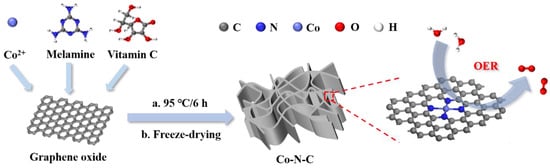 The preparation process of the Co-N-C aerogel electrocatalyst is shown in Figure 1. In brief, graphene oxide (GO), cobalt chloride (CoCl2), melamine, and vitamin C (VC) are mixed in the desired proportions and the Co-N-C aerogel electrocatalyst is obtained by chemical reduction at a reaction temperature of 95 °C and via further vacuum freeze-drying. In our synthetic strategy, the graphene aerogel inherits the abundant vacancies of GO, which can be used for the embedding of nitrogen and metal atoms [24,25]. Meanwhile, both GO and metal ions can be reduced by VC as a strong reductant [26]. It is found that the Co (0.5 wt%)-N (1 wt%)-C aerogel electrocatalyst has the optimal OER activity at a current density of 10 mA/cm2, as shown in Figure S1.