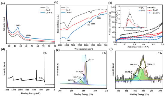 (a) XRD, (b) FT-IR, and (c) N2 adsorption–desorption isotherms and the BJH pore size distributions of GA, Co-C, and Co-N-C. XPS (d) survey, (e) C 1s, and (f) N 1s spectrum of GA, Co-C, and Co-N-C.