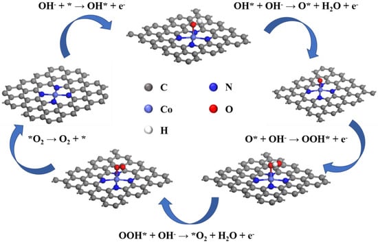 Structural diagrams of Co-N-C for each primitive process of OER (alkaline conditions).