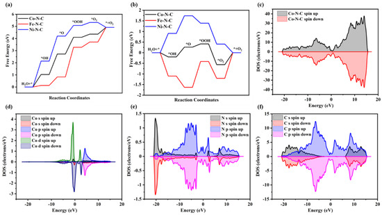 (a) Gibbs free energy variation in different aerogels for each of the OER primitive processes. (b) Gibbs free energy variation in different aerogels in each primitive process of OER (U = 1.23 V). (c) The total density of states, (d) partial density of the state of Co atom, (e) partial density of the state of N atom, and (f) partial density of the state of C atom of the Co-N-C.