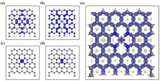 To further investigate the electronic structure changes, the total density of states (TDOS in Figure 6c) of Co-N-C aerogel electrocatalysts and the partial density of state (PDOS) of Co, N, and C atoms have been calculated. As shown in Figure 6d, the spin-up and spin-down electrons are asymmetric along with the energy levels, with the d-orbital electrons induced by the Co atom occupying most of the top of the valence band and the spin-down d-orbital electrons occupying most of the bottom of the conduction band. Furthermore, according to Figure 6e,f, both C and N atoms in the N-doped graphene lattice show symmetric spin-up and spin-down electrons, and the p-orbital electrons have a contribution to the Fermi energy level of the electrocatalyst. It is noteworthy that the s-orbital electrons of the N atom are slightly asymmetric near the Fermi energy level, which may be the influence of the N atom by the Co atom close to it. In the PDOS of the electrocatalyst (Figure 6d–f), the PDOS of Co, N, and C atoms near the Fermi energy level overlap, suggesting that there is an interaction to enhance the catalytic performance of the OER. To better understand the DOS of the electrocatalyst, a schematic illustration of the top of the valence band and the bottom of the conduction band of spin-up and spin-down electrons are constructed, as shown in Figure 7a–d. The spin-up electrons of C and N atoms and the spin-down electrons of Co atoms form the top of the valence band and the bottom of the conduction band of the electrocatalyst. The electron density difference of the electrocatalyst is further investigated for the interactions between Co, N, and C elements. It can be seen from Figure 7e that the electrons are mainly concentrated in the chemical bond and the electrons on the Co atom migrate towards the N atom. In addition, the electron distribution on the Co atom is consistent with the stretching direction of the 3d orbital of the Co atom [34].