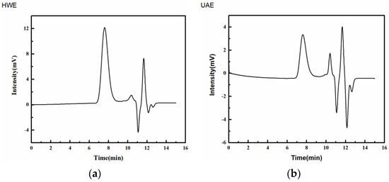 GPC chromatogram of HWE and UAE: (a)—HWE, (b)—UAE.
